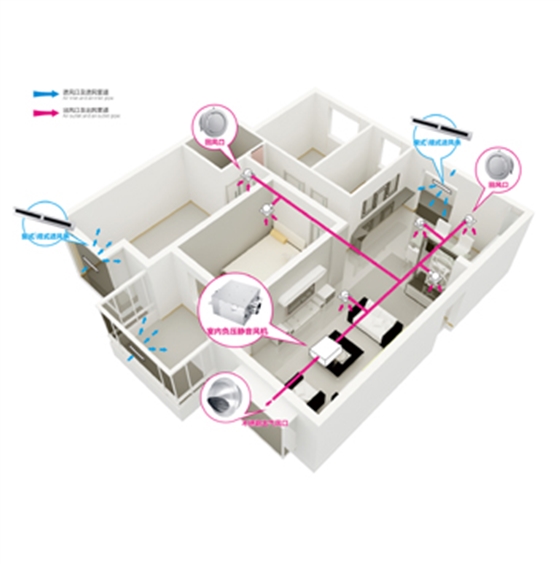 單向流新風(fēng)系統(tǒng)采用“強(qiáng)制排風(fēng),自然進(jìn)風(fēng)”原理,通過(guò)排風(fēng)機(jī)將室內(nèi)污濁空氣排出,形成負(fù)壓,使室外新鮮空氣通過(guò)門窗縫隙或進(jìn)風(fēng)口自然進(jìn)入。